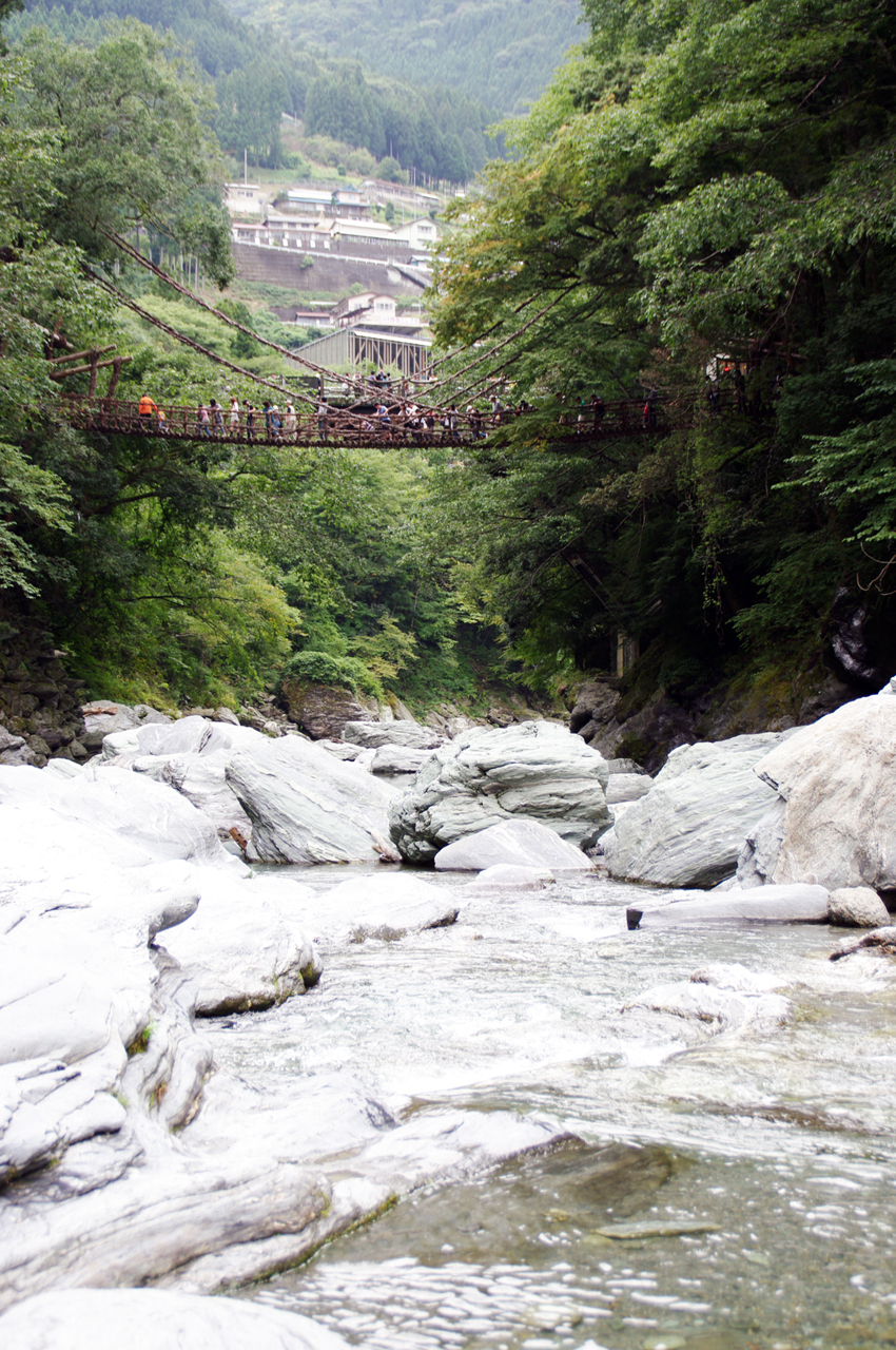 そんなこんなでたどり着いたのが「かずら橋」。渓谷に蔦みたいの編んで作られた橋ってなわけで、観光名所になっている。